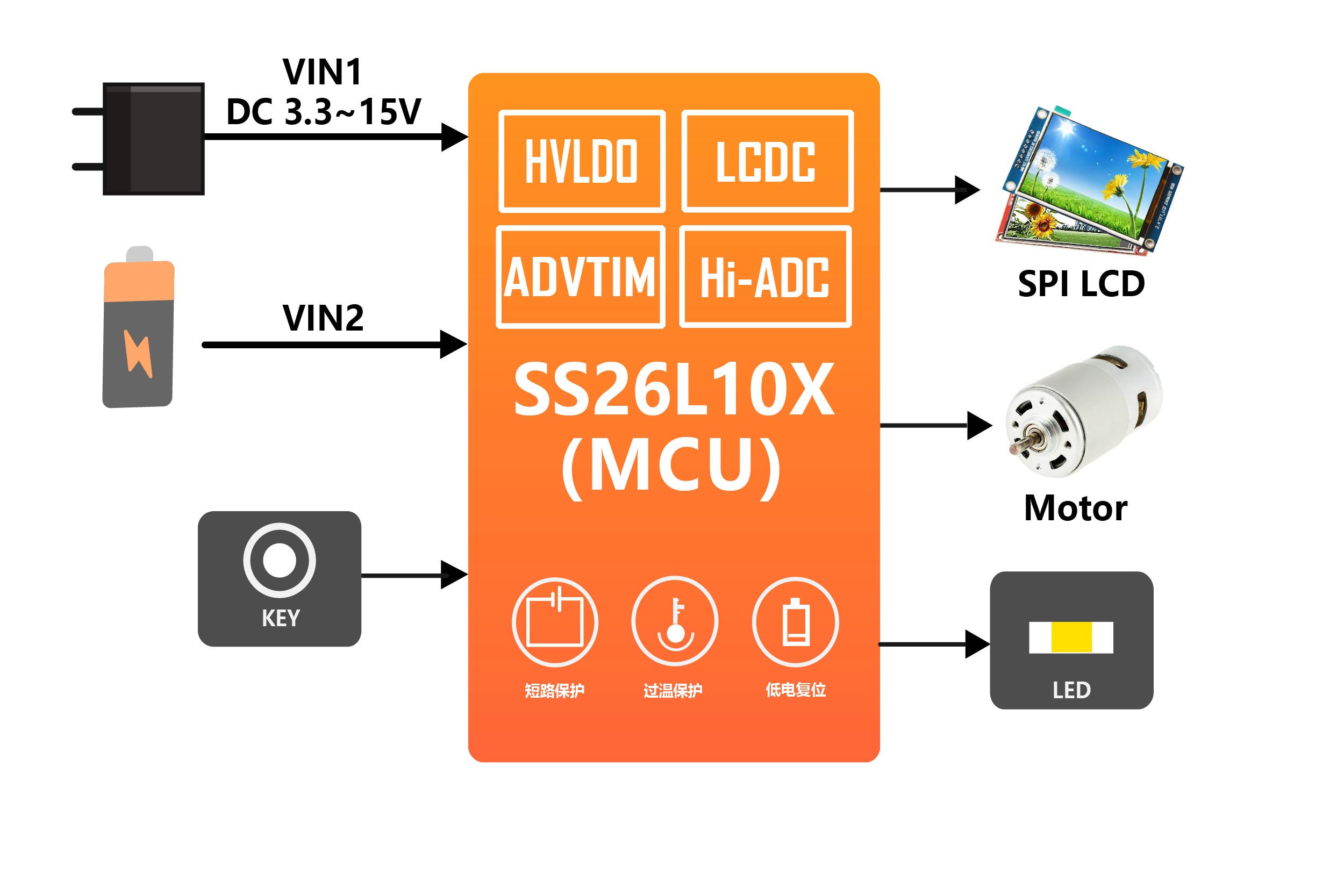 SS26L10X is one of the high-energy consumption ratio MCU chip series based on RISC-V architecture, integrating a high-voltage LDO that supports 15V input voltage and 5V output voltage, and can support direct power supply from 3-series batteries or a 12V adapter. It is an entry-level RISC-V MCU with high reliability, large memory space, and a good balance between high computing power and low power dissipation. Suitable for application scenarios such as smart wearable devices, motor drive control (home cleaning equipment, electric transportation equipment), smart power devices (multi-cell battery packs, fast charging and wireless charging devices), etc.