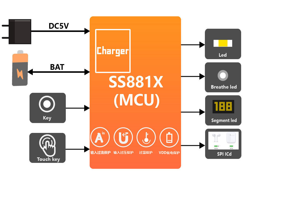 SS881X is a microcomputer with integrated power management functions and supports touch detection, which is mainly used in portable personal appliances that need to be charged, such as Bluetooth earphone charge cases, LED lights, handheld atomizers, EC, aroma diffusers, fragrant smoked lights, electronic toys, and so on.