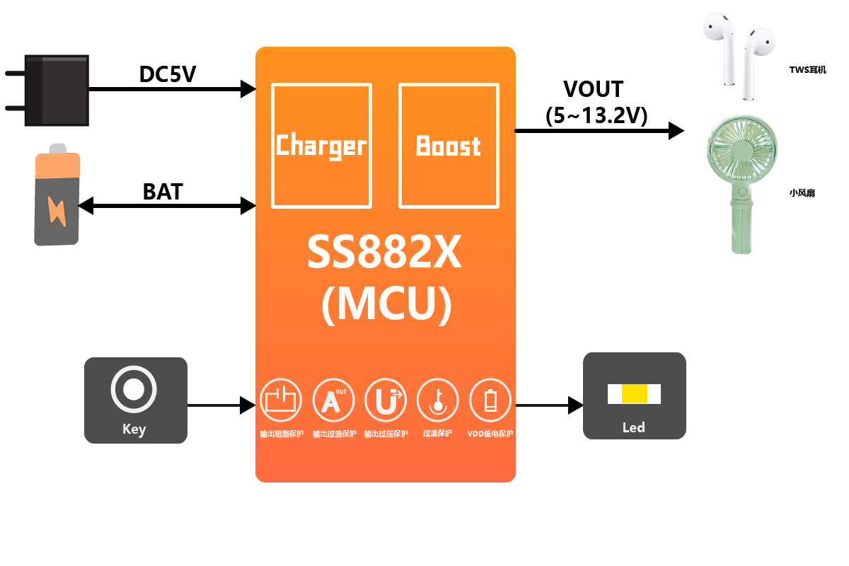 SS882X is a microcontroller with high withstand voltage linear charger and asynchronous boost function, which is mainly used in electronic devices that need to be charged, such as small fans (support 5V, 7V, 9V, 12V, and other motors), TWS charge cabin, 2 or 3 lithium batteries charge, 2 or 3 lithium batteries power supply equipment, and other extended applications with batteries that need to be charged.
