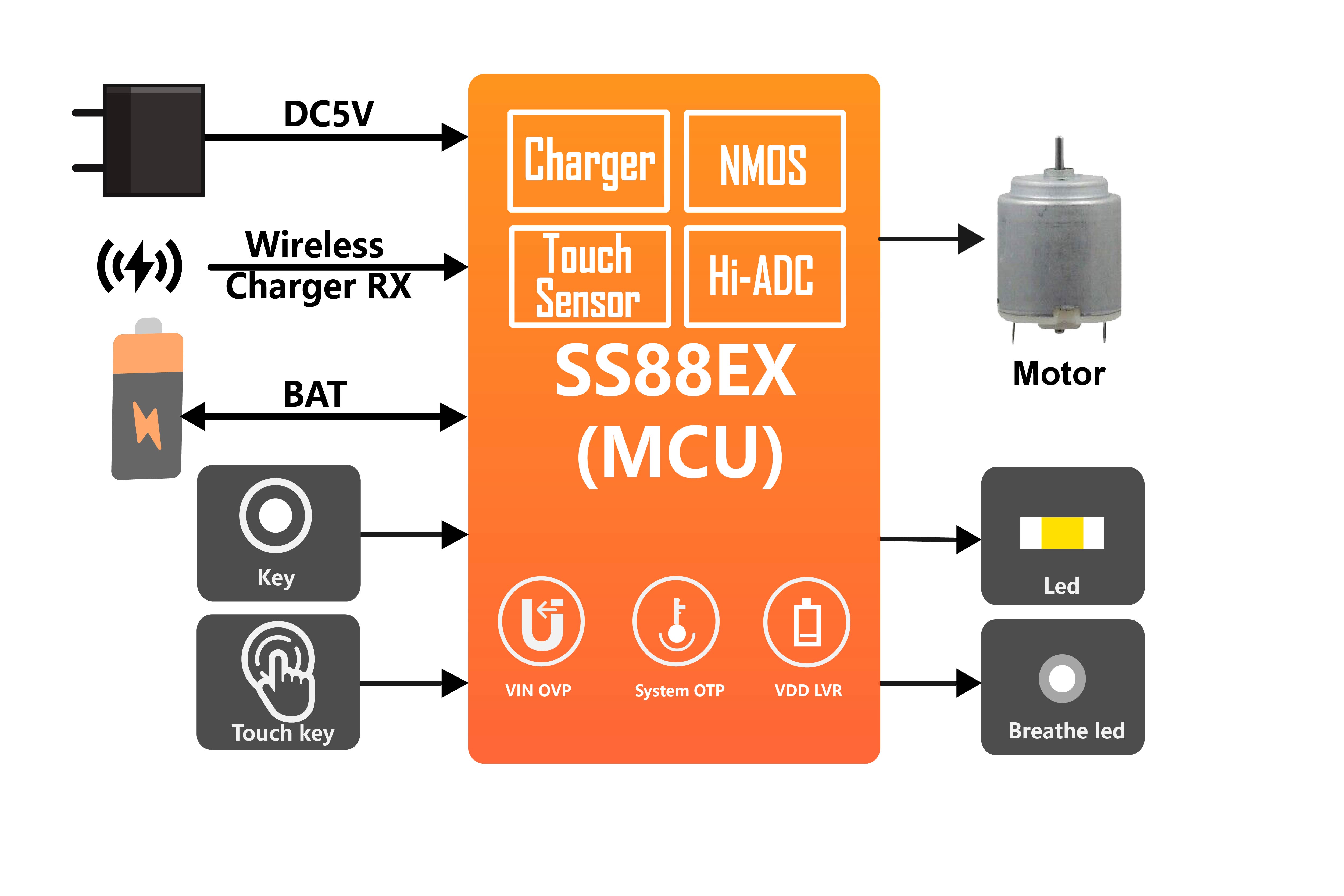 SS88EX is an 8-bit low-power microcontroller developed by Sinhmicro that integrates power management, motor control and touch detection functions, with a clear memory architecture, complete system-level control, and built-in rich interfaces, flexible configuration modes, and different low-power options. This product is mainly used in portable intelligent electronic devices that require charge and intelligent control, with a small chip area, bringing streamlined peripheral costs, superior overall performance, and convenient development.