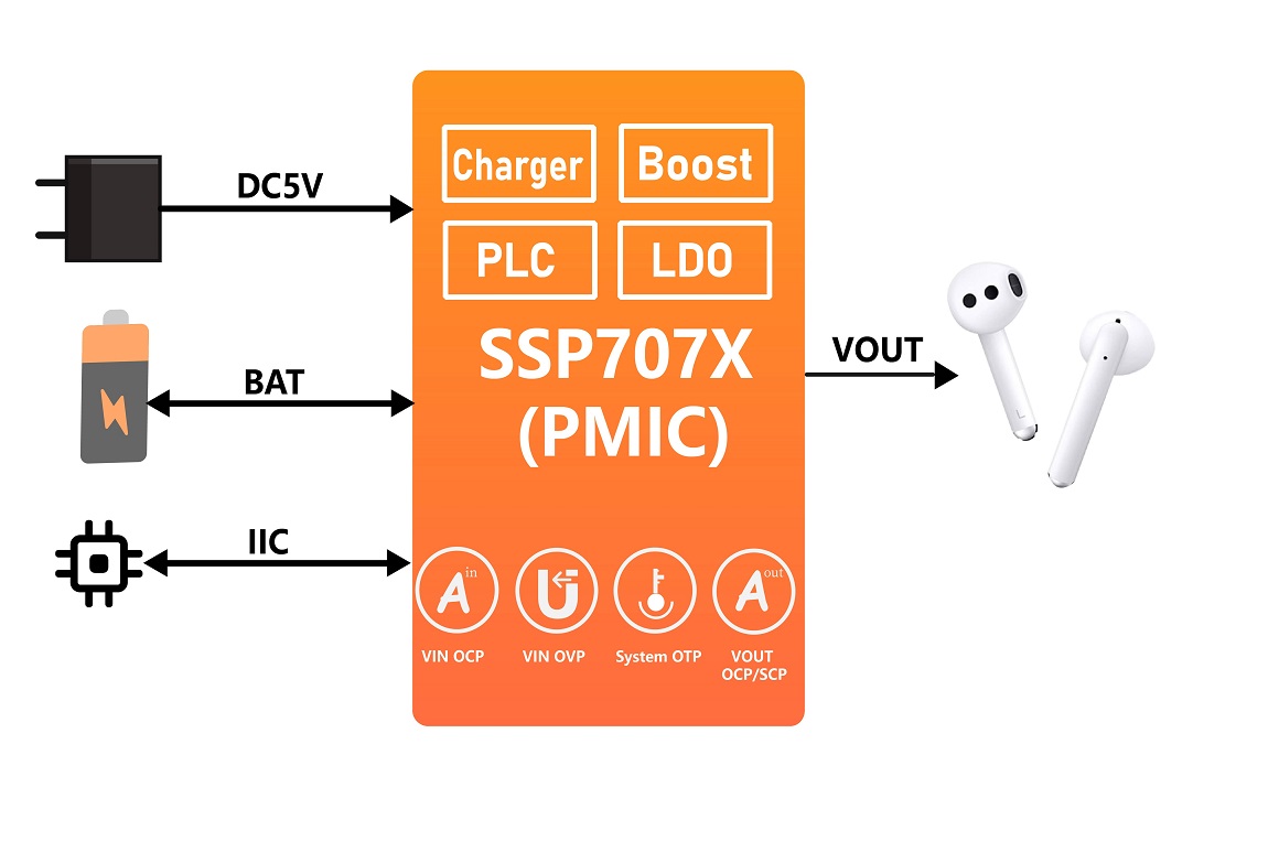 SSP707X is a power management chip (PMIC) designed by SinhMicro for applications such as smart charge compartments of Bluetooth headsets, and smart watches. The chip integrates an overvoltage protection circuit, and the input withstand voltage is as high as 38V; The chip has a built-in high-efficiency switching charge module (Charger) and a boost module with adjustable output voltage to meet the needs of fast charge and earphones synchronous charge in the smart charge compartment; On-chip integrated Power Line Carrier (PLC) control module for data communication on the power path; The chip can be used alone or with MCU through the IIC interface; In response to the solution requirements of TWS, the chip has built-in headphone plug-in or pull-out detection wake-up circuit and UART Communication Level Shift module, which greatly simplifies the peripheral materials of the solution.