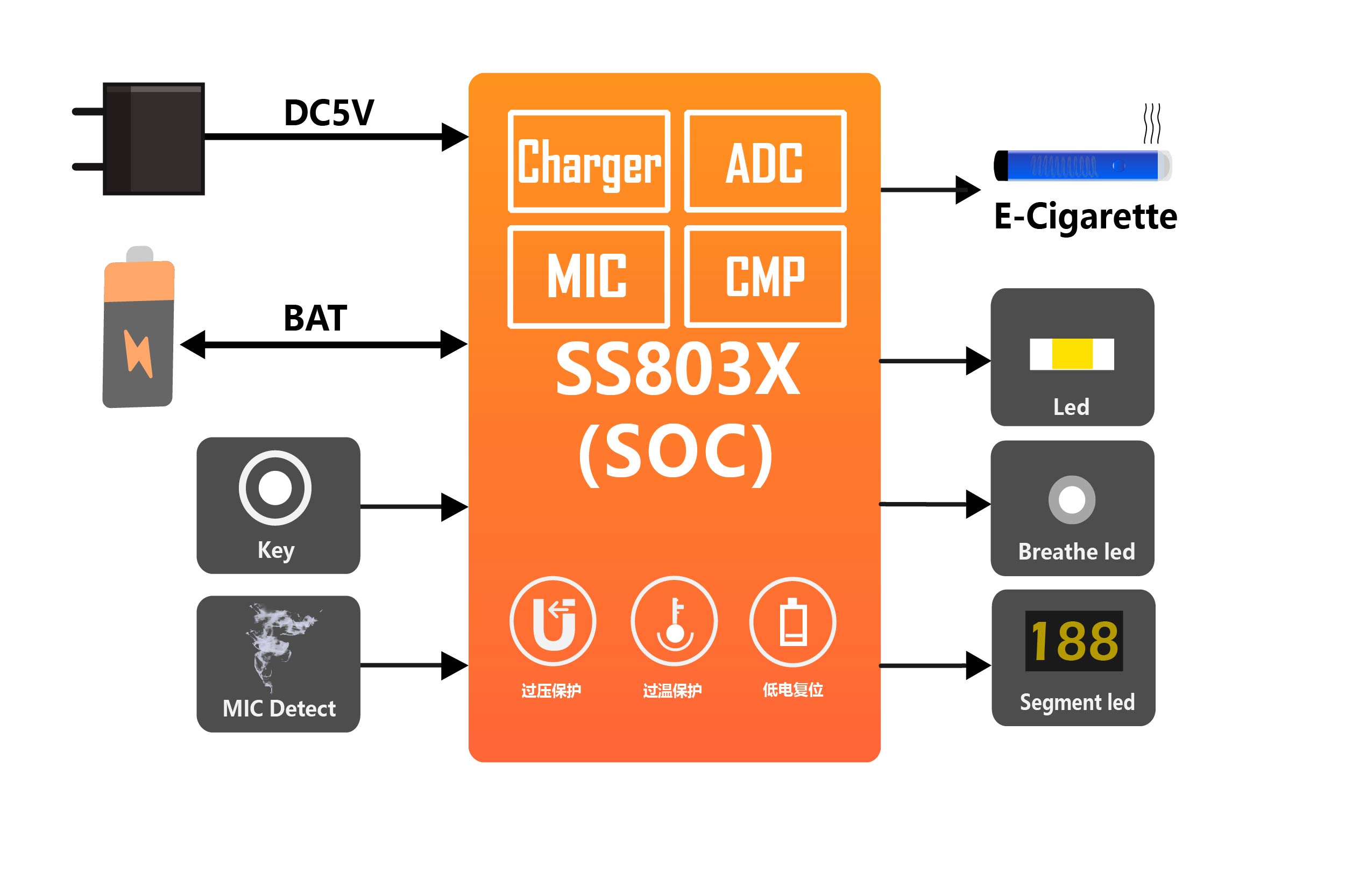 SS803X is a special MCU development by Sinhmicro for electronic cigarettes that integrates MIC detection, heating wire resistance detection, and short-circuit protection.