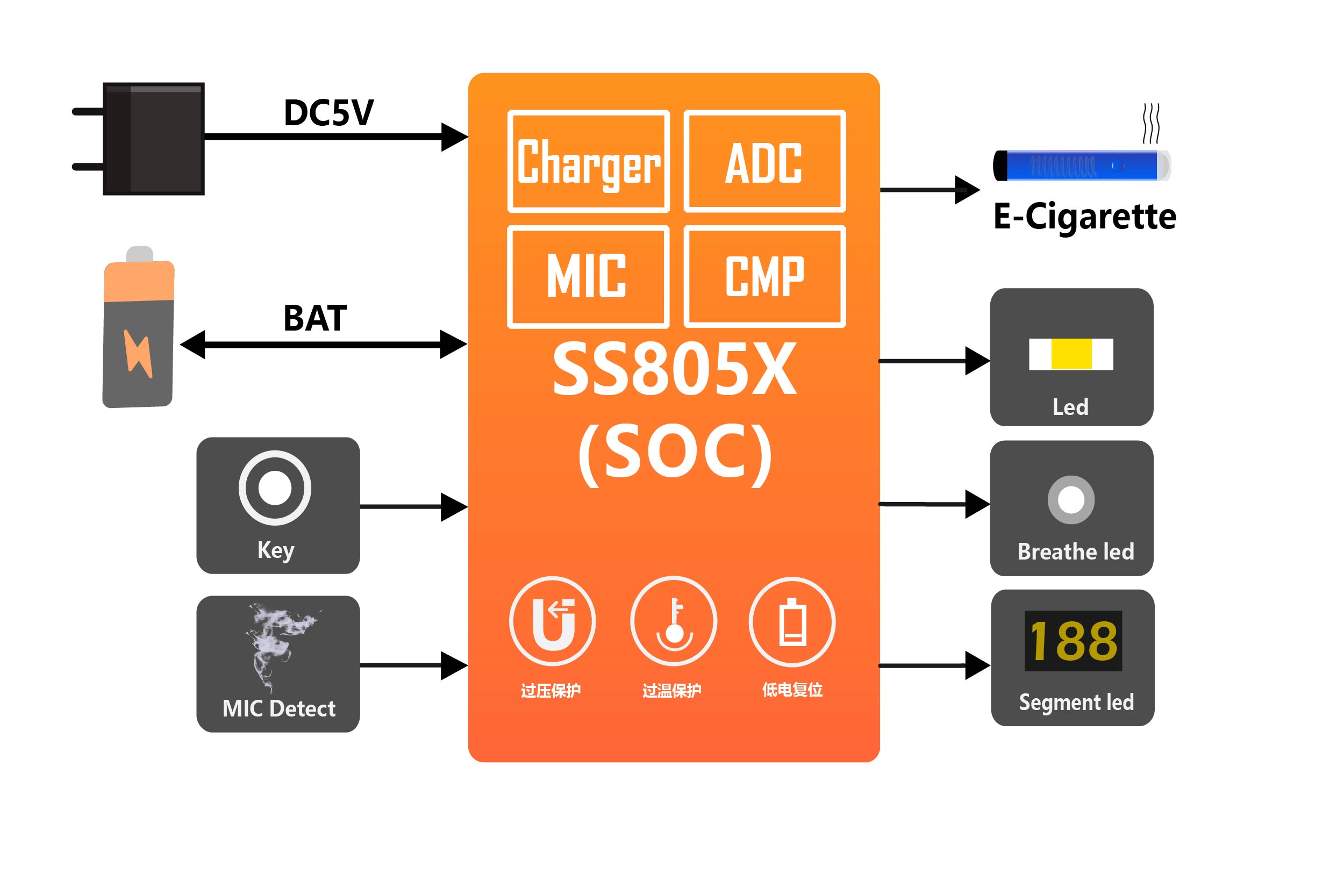 SS805X is a special MCU developed by SinhMicro for E-cigarettes that integrates MIC detection, heating coil resistance detection, and short-circuit protection.
