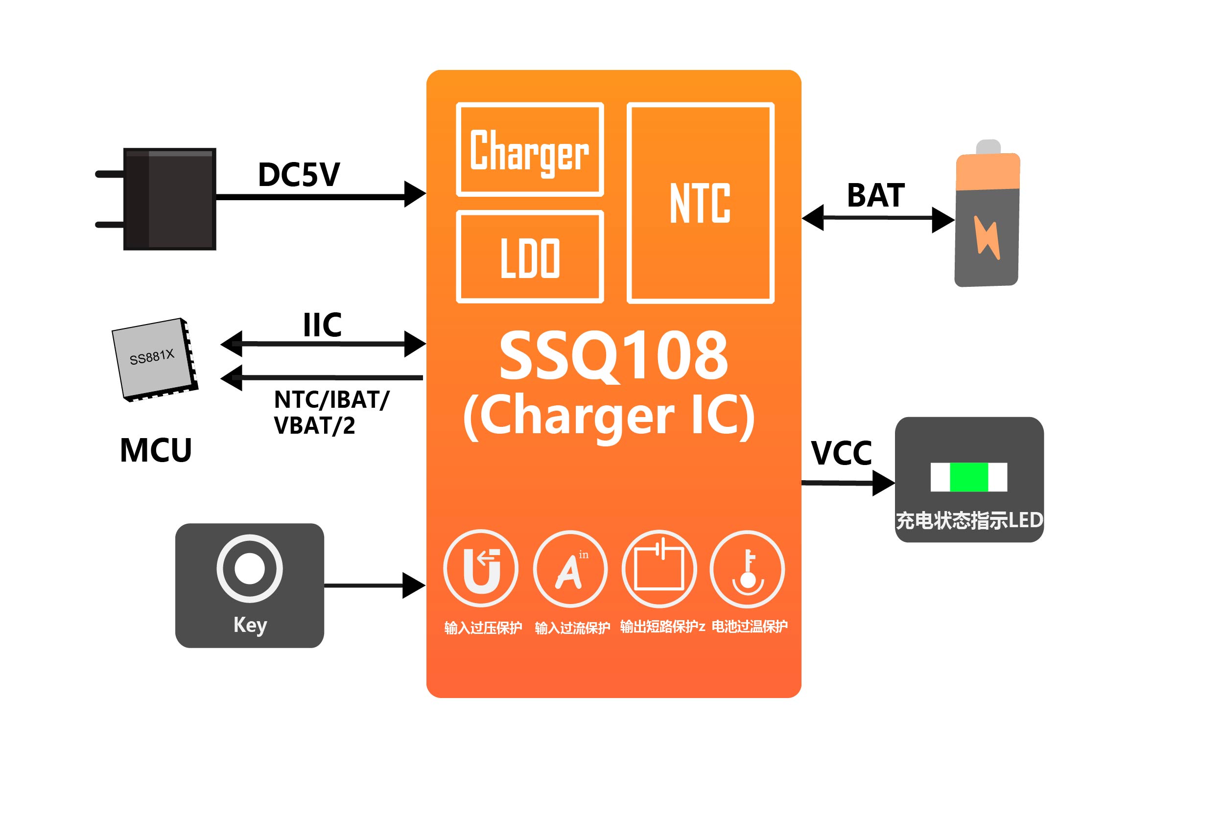 SSQ108是支持IIC通信的1.5A开关Charger芯片。集成过压保护电路,输入耐压高达38V。内置高效开关Charger充电模块,充电参数可以通过IIC接口灵活调整。