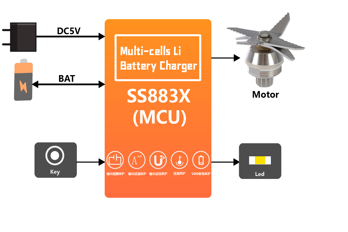 SS883X是一款高耐压、支持多节锂电池充电的MCU,主要应用于需要充放电的电子设备,如果汁机,电动工具,2 节/3 节锂电池充电及供电的设备, 以及其它带多节锂电池需要充电的扩展性控制应用。