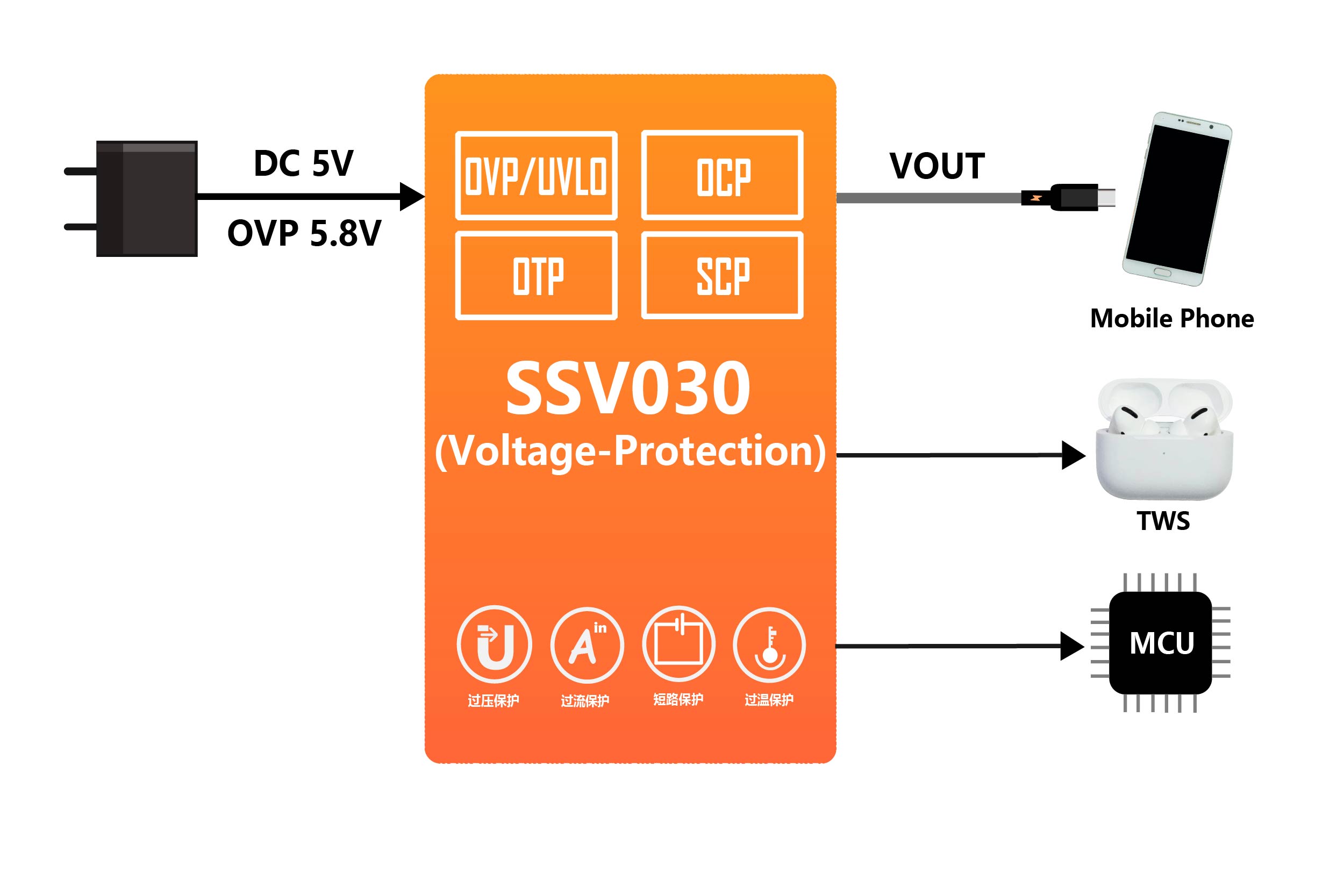 SSV030是昇生微研发的一款高性价比的过压/过流保护芯片。芯片的最大输入耐压为33V,保护电压为5.8V。过流关断的最大电流为2A。发生OCP/SCP一段时间后,系统会自动尝试重新启动。