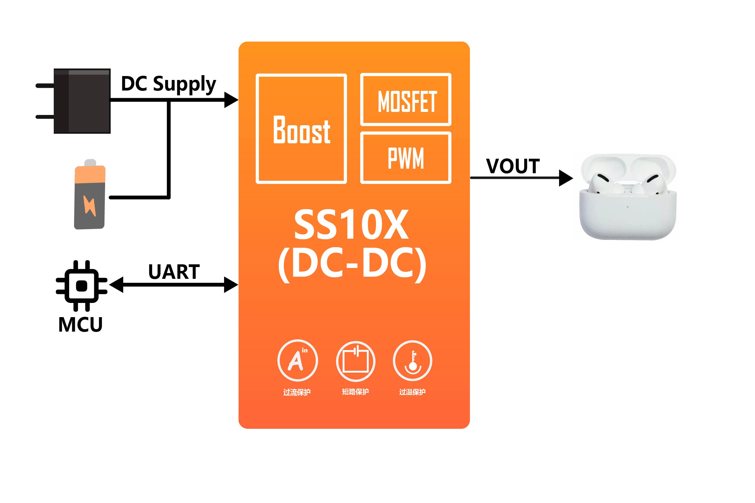 SSD10X是一种低功耗高效的同步升压转换器。转换效率高,外部元件少,方案占用面积小,支持短路保护,输出电压可调节。同时集成了UART单线通信,可用于开启直通模式给耳机充电并增加充电仓的充电次数。