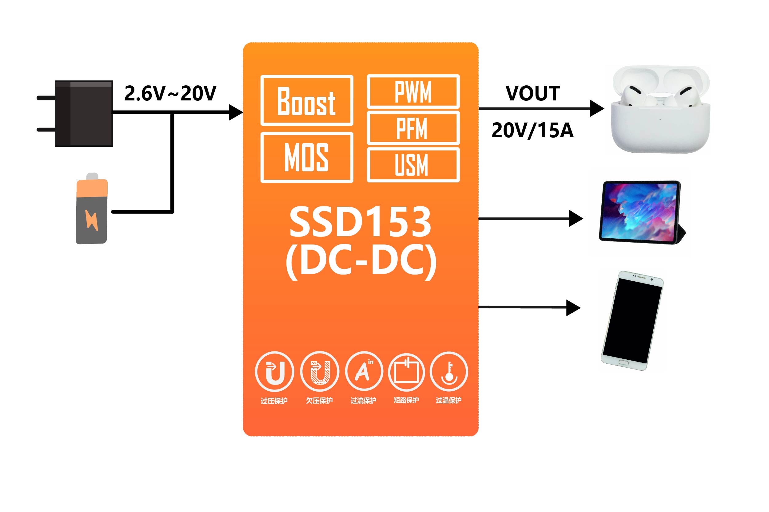 SSD153是一款同步高效升压转换芯片。支持在PFM、PWM和USM模式之间转换,以适应高效率或低噪声的不同需求。SSD153设计用于输出高达20V电压和15A电流的开关能力,以提供超过40W的功率。该转换器使用自适应恒定关断时间和峰值电流控制方案,以最小的输出电容提供出色的瞬态线路和负载响应。内部环路补偿和软启动时间使外部组件数量最小化。它还支持从300kHz到2MHz的可调开关频率,用于不同的电感器和输出电容器组合。