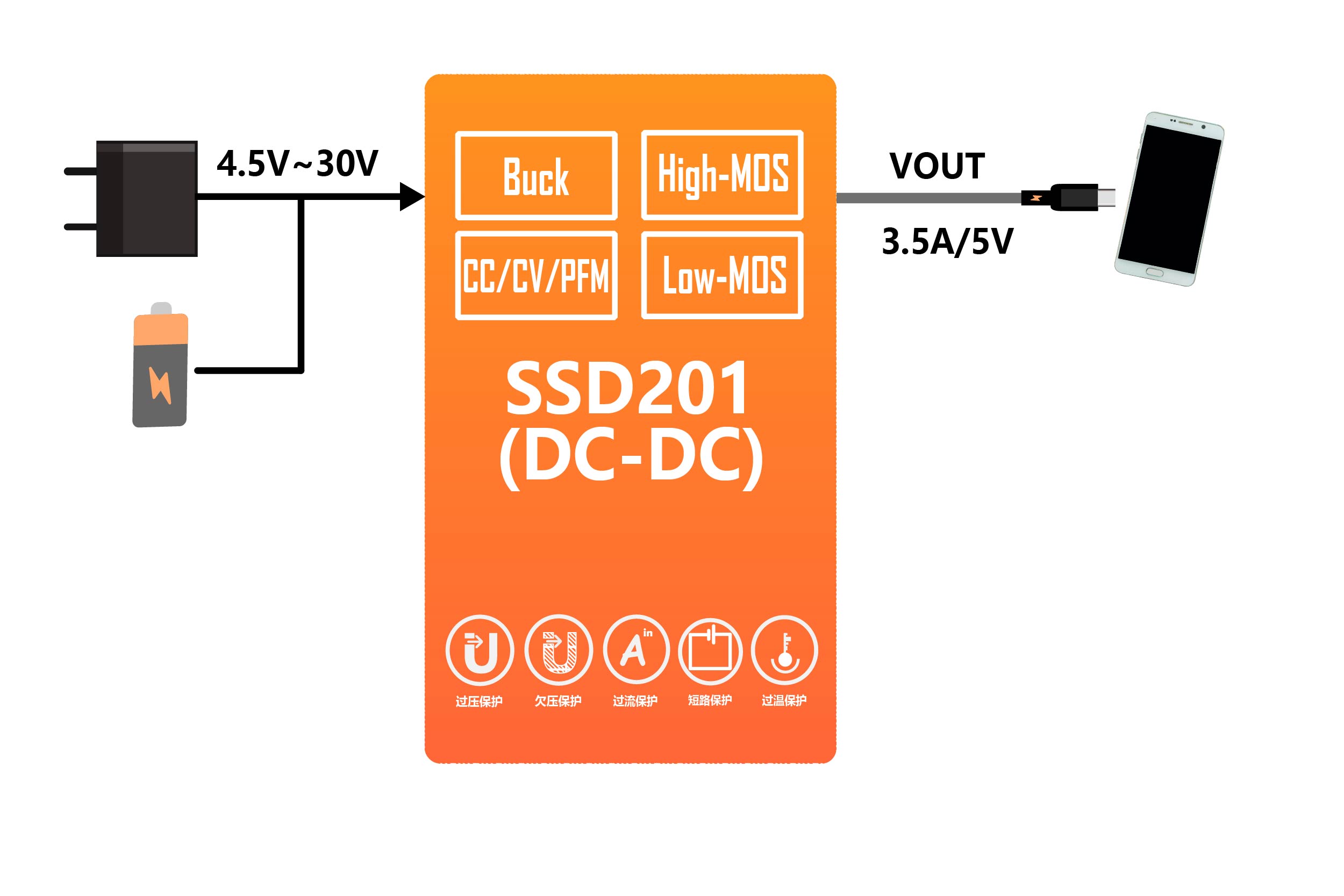 ◼ 宽范围输入电压:4.5V~30V